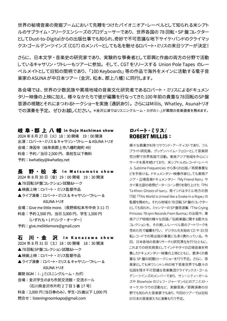Robert Millis and Bardo Todol have each released music on many different labels: Sublime Frequencies, Dinzu Artefacts, The Helen Scardale Agency, Discrepant, Abduction Records, Dust-to-Digital, Fire Breathing Turtle, Sub Pop, and Ikuisuus.